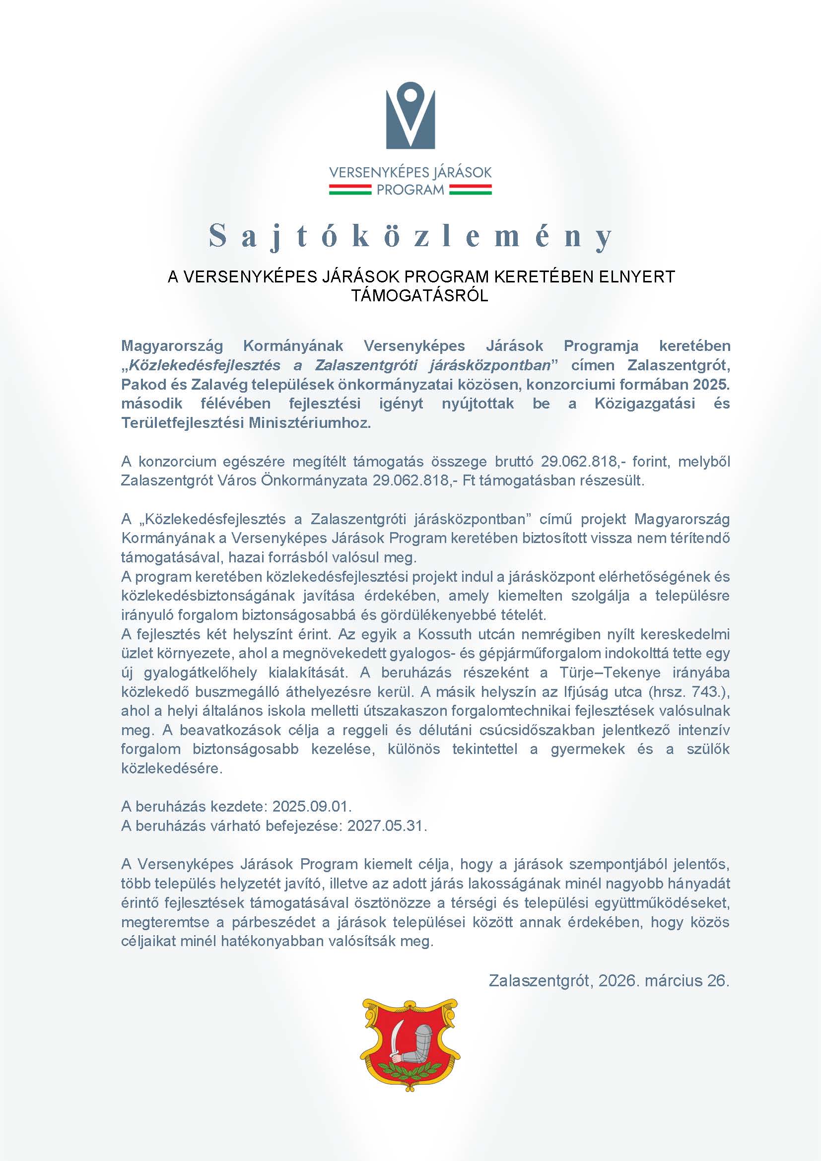 A projekt Magyarország Kormányának a Versenyképes Járások Program keretében biztosított 29.062.818,- forint összegű támogatásával valósul meg.