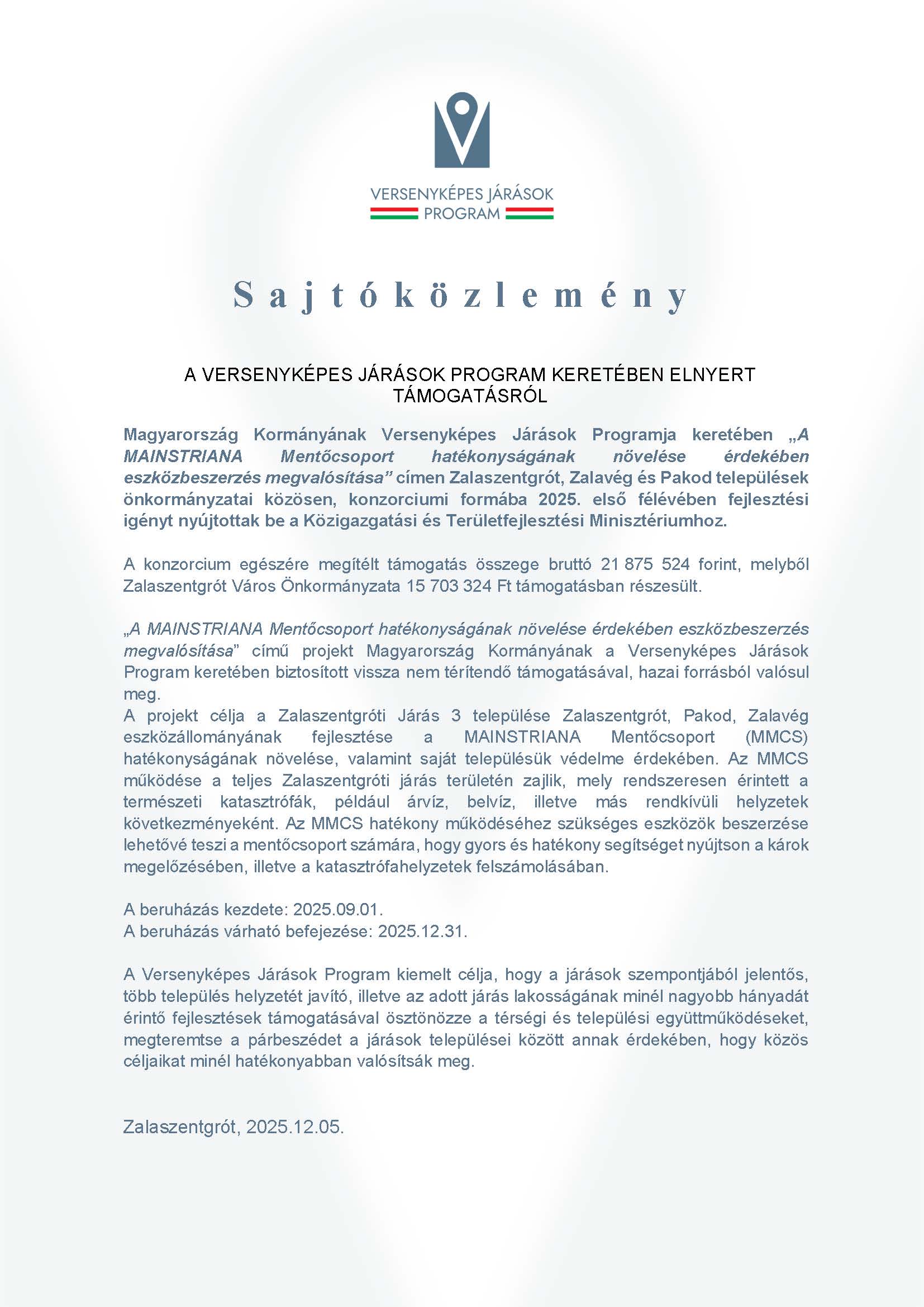 A projekt Magyarország Kormányának a Versenyképes Járások Program keretében biztosított 21 875 524 forint összegű támogatásával valósul meg.